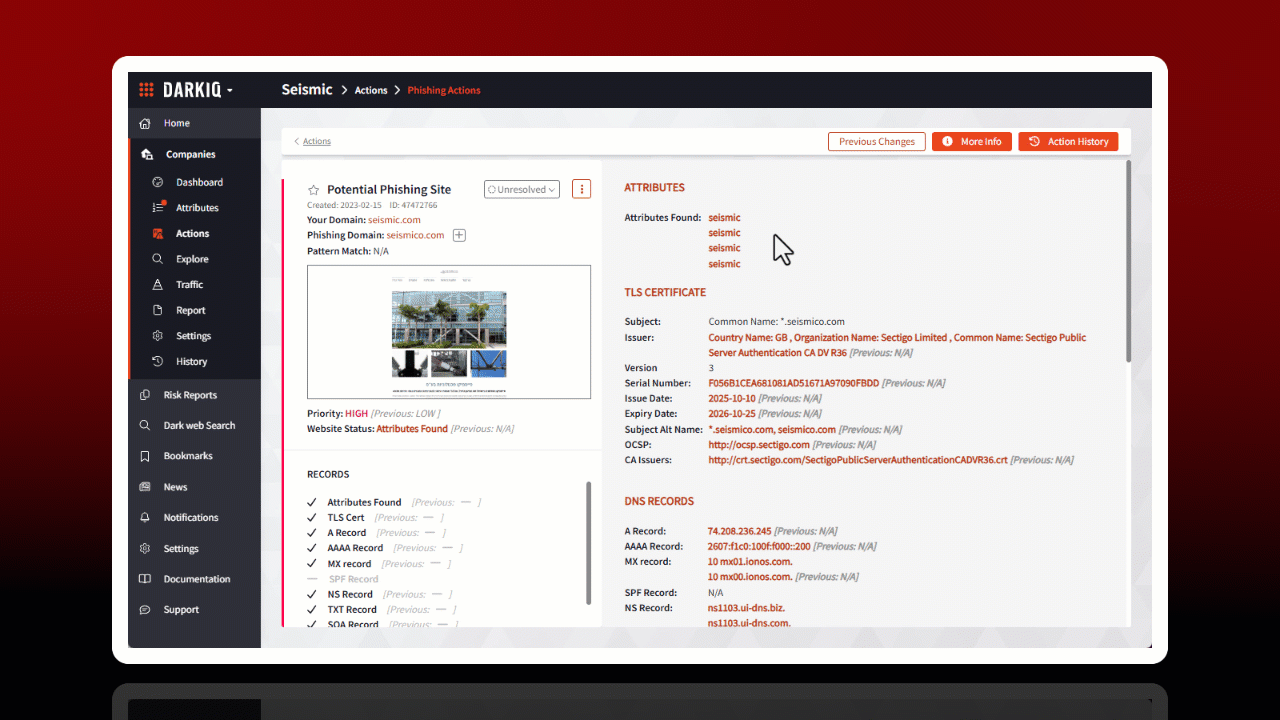 We released an enhancement to phishing alerts in our preemptive monitoring solution, DarkIQ, giving security teams full visibility into evolving phishing risks and brand impersonation attempts. With this update, analysts can now track changes between versions and identify spoofing sites before they are leveraged in full-scale attacks against your customers and people.