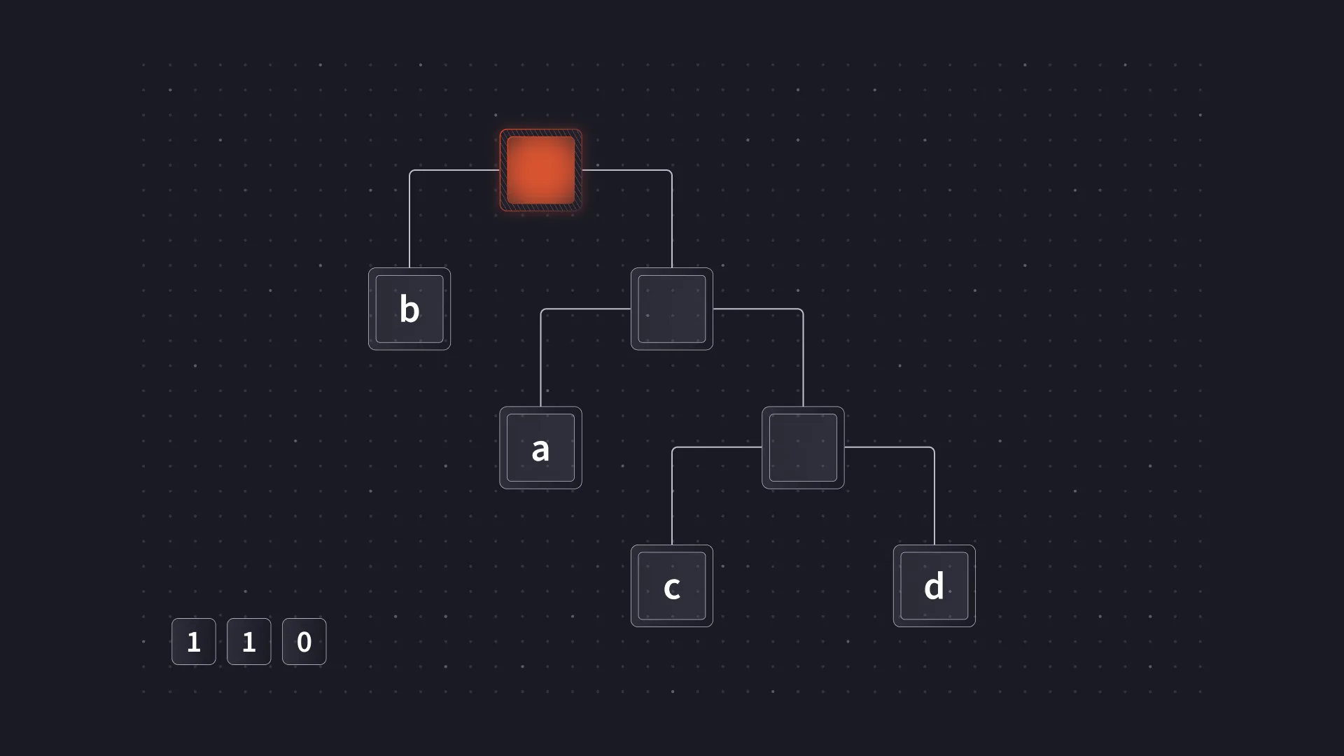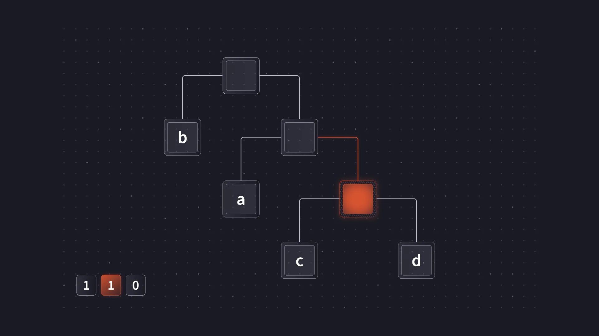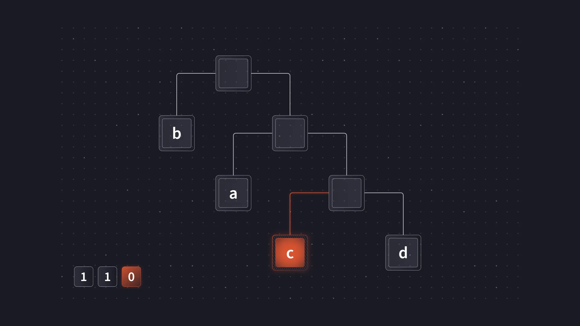 Since the code length code is used to encode the other two codes, we started with that one. To do this, we copied the code length code from ascii-zip and added or moved values as needed. The only lengths we would be using were 0, 2, 6 and 8. We would also use symbol 16 to repeat previous code lengths and symbol 18 to specify a run of zeroes. There is some logic behind the lengths chosen. Each code length code is defined with 3 bits, so the longest code we can use is only 7 bits long. This is just short of a full byte. A full byte would make it easy to keep the payload aligned as we could do something similar to what we did with the literal/length codes. Since we cannot use an 8 bit code, we instead use two 4 bit codes which ensures every two are aligned.