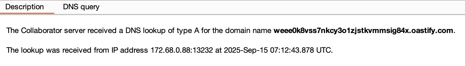 The request was accepted, and moments later, we saw the DNS callback in Burp Collaborator.